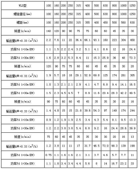 WLS系列螺旋輸送機(jī)主要技術(shù)參數(shù):